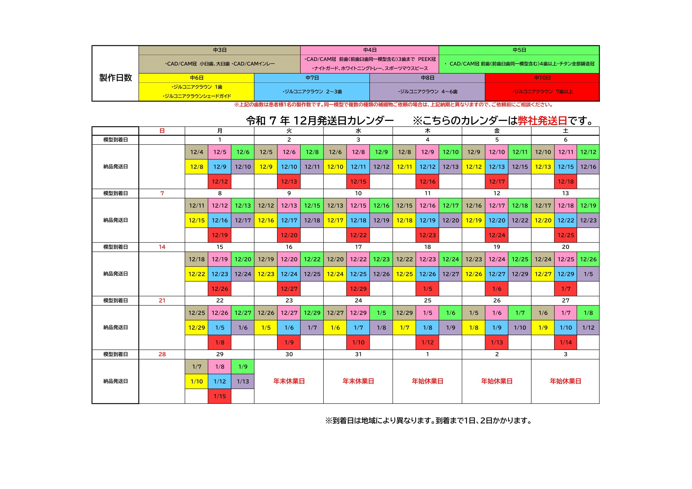 令和7年12月 補綴物発送日カレンダー