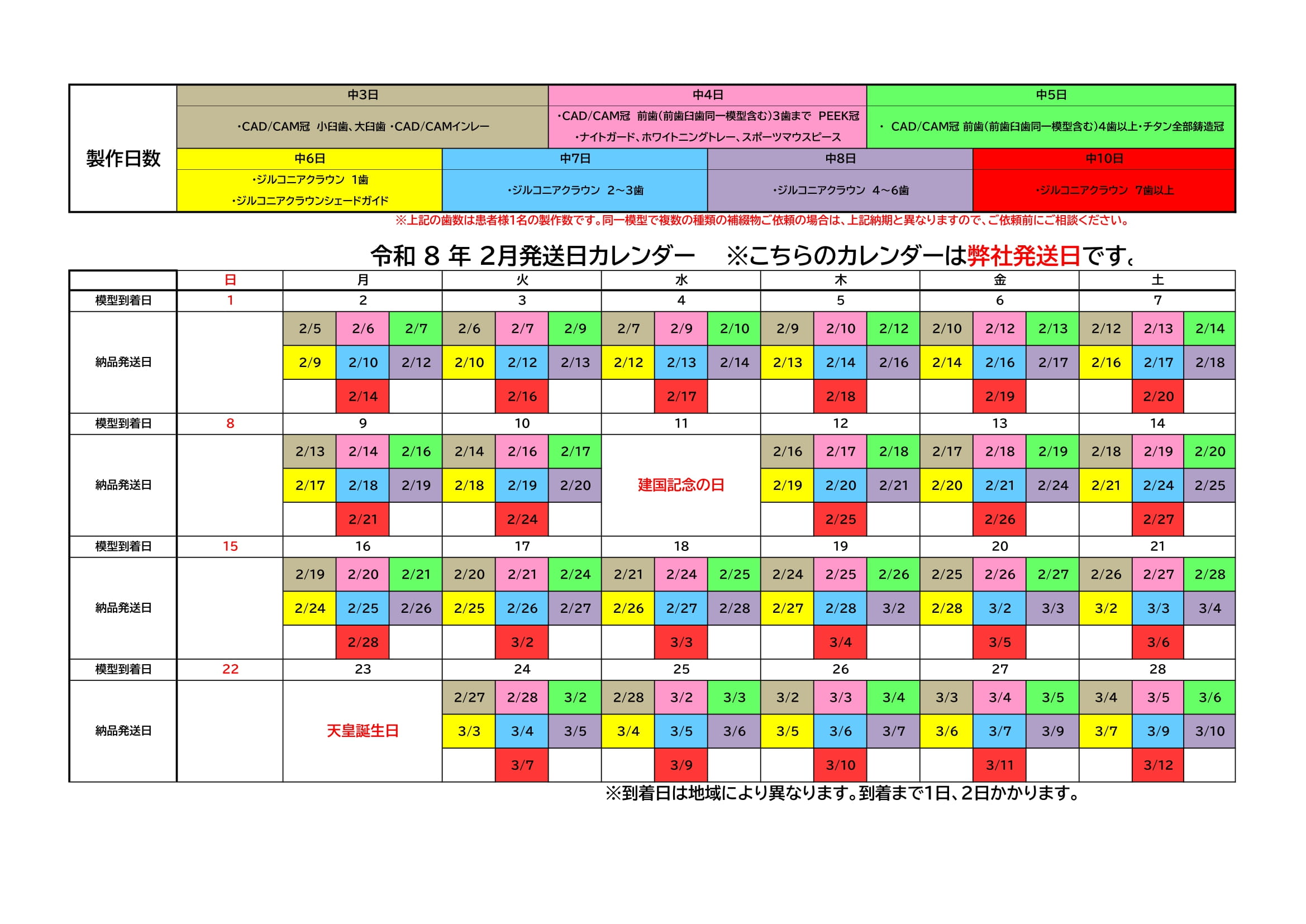 令和8年2月補綴物発送日カレンダー
